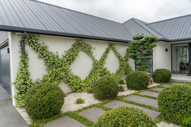 Carol and Colin purchased this property in 2023 – three years after it was built. Carol wanted a minimalist garden in green, white and yellow. Carol and Colin have restructured the garden to achieve her desired minimalist look. She likes the way this complements the style of their house.