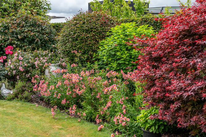 From a bare fenced farm acre, the garden was begun in 2002, following the house build. Jan’s collection of 185+ different hydrangeas began in 2013 – there are now 350+ in the garden with many in pots to assist with their colouring – blue in the acidic soil.